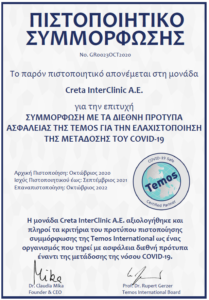 Η Ιδιωτική Γενική Κλινική «CRETA INTERCLINIC” Θεραπευτικό-Διαγνωστικό-Χειρουργικό & Ερευνητικό Κέντρο , μέλος του Ομίλου HHG (HELLENIC HEALTHCARE GROUP) πάντα πιστή στις αρχές της για διαρκή βελτίωση και παροχή αναβαθμισμένης ποιότητας υπηρεσιών υψηλού επιπέδου στους πελάτες της, ολοκλήρωσε με επιτυχία τη διαδικασία πιστοποίησης συμμόρφωσης σύμφωνα με τα διεθνή πρότυπα ασφάλειας του Διεθνή Οργανισμού Διαπιστεύσεων Temos International για την ελαχιστοποίηση της μετάδοσης της νόσου COVID-19.